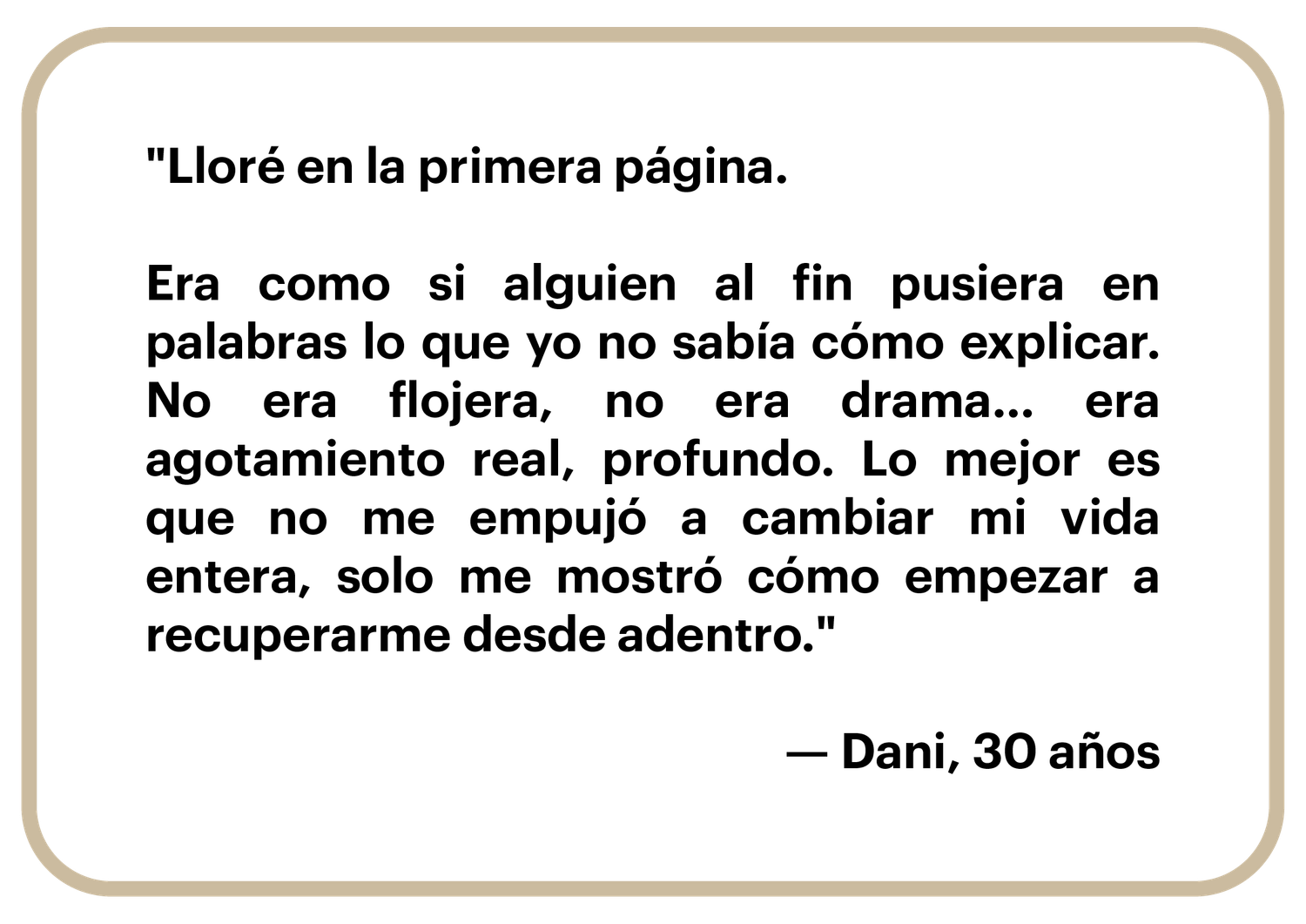 Con esta guía vas a pasar de ignorar tu cansancio a reconocerlo sin culpa. Aprenderás a escucharte sin juzgarte, a darle nombre a eso que llevas sintiendo hace meses o años.